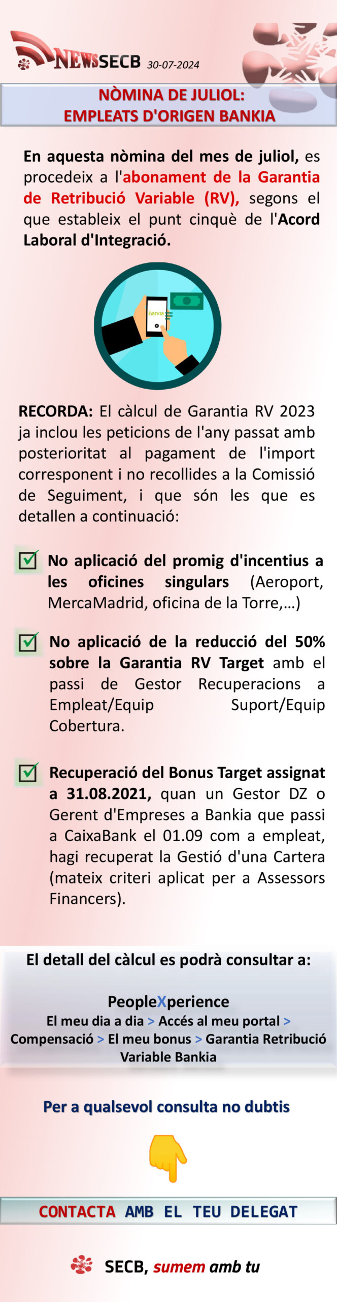 NÒMINA DE JULIOL: EMPLEATS D'ORIGEN BANKIA30/07/2024Bankia, Flash News By SECB, Fulls EstatalsAnna Sierra 733 733Missatge de navegacióAnterior PERMÍS PARENTAL 8 SETMANESSegüent INCIDÈNCIA ABONAMENT DE TARGETES RESTAURANT